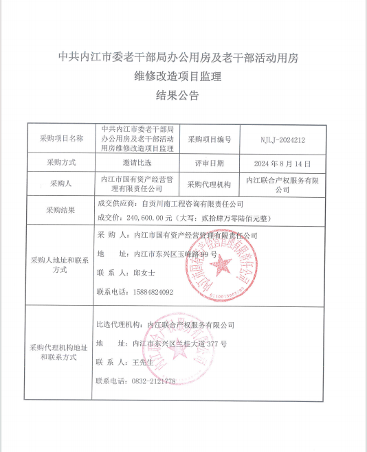 中共内江市委老干部局办公用房及老干部活动用房维修改造项目监理结果公告