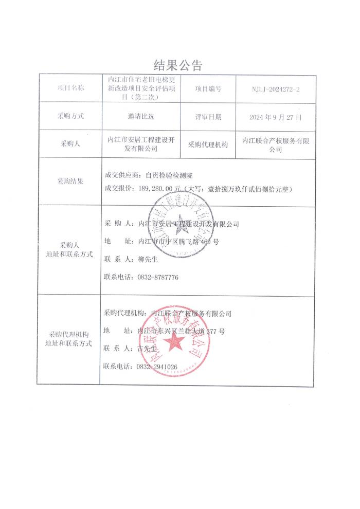 内江市住宅老旧电梯更新改造项目安全评估项目(第二次)结果公告