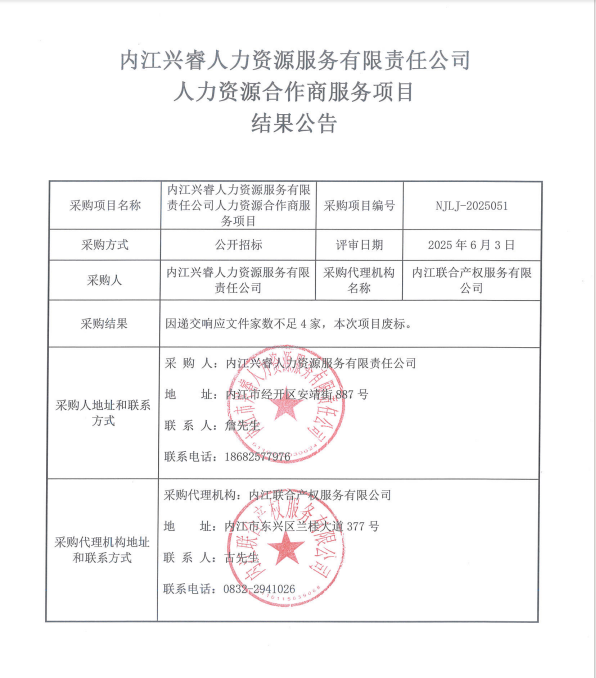 内江兴睿人力资源服务有限责任公司人力资源合作商服务项目结果公告
